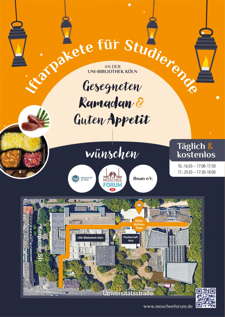 Liebe Studierende und Kölner Bürger, der Ramadan ist eine Zeit der Besinnung, des Miteinanders und der Solidarität. In diesem Sinne möchte das MoscheeForum mit der Unterstützung des Ihsan e.V. und der Universität zu Köln einen Beitrag leisten und Studierende sowie Bedürftige während des Fastenmonats unterstützen.