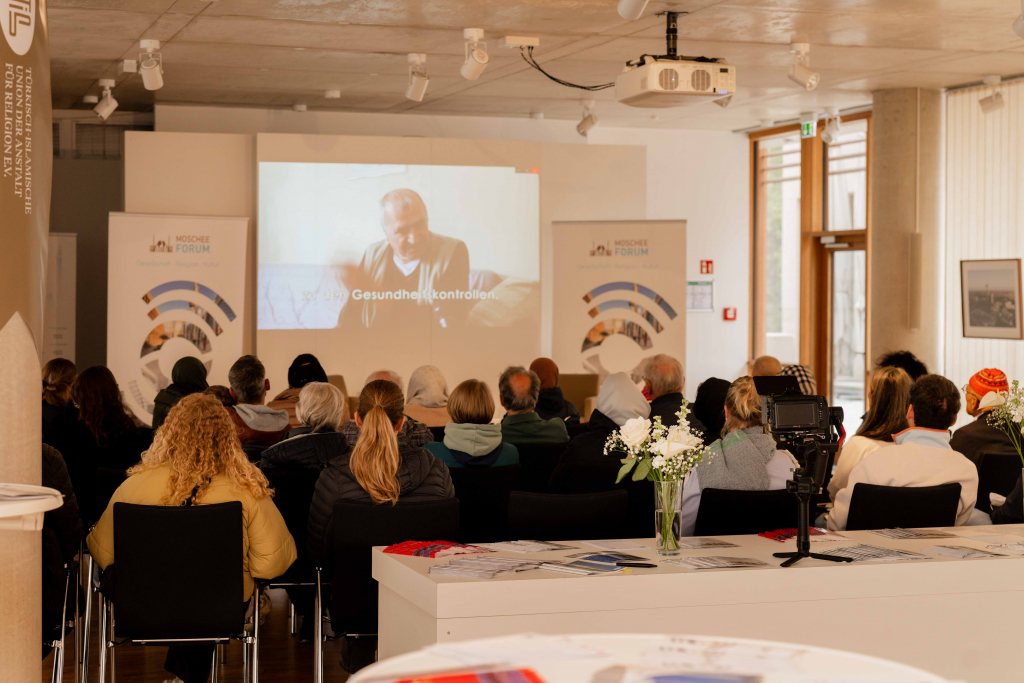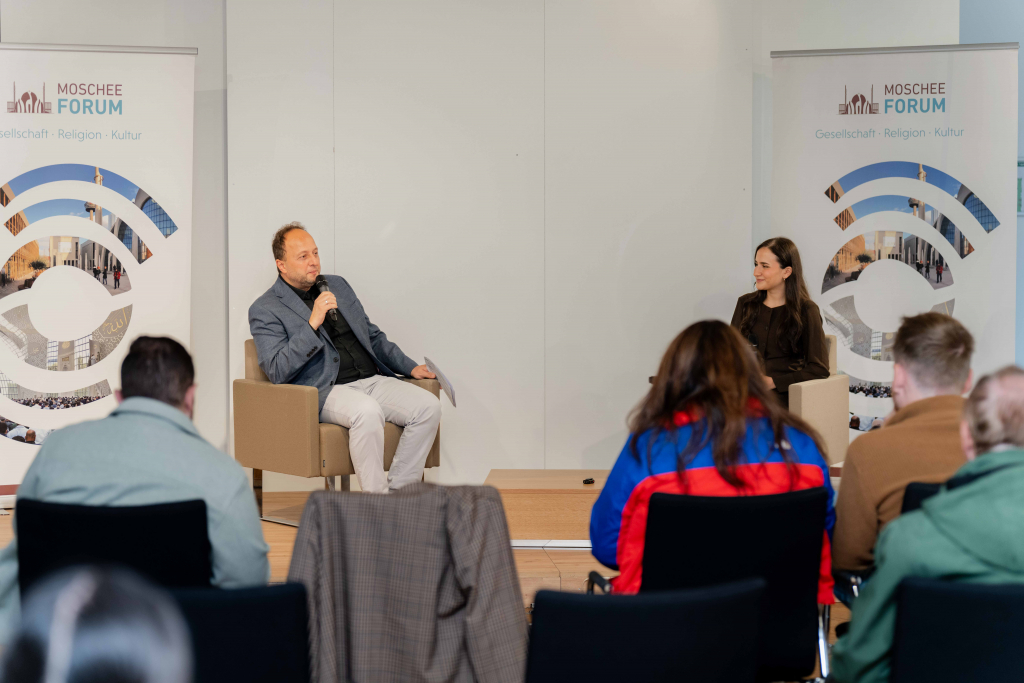 Die Ausstellung des Kölner Fotografen Hans Georg Esch führte die Gäste mit eindrucksvollen Bildern auf eine Zeitreise durch die Geschichte und Architektur der Zentralmoschee. Ergänzt wurde das Angebot durch Filmvorführungen der Werke „Kismet 1“ und „Kismet 2 – Eine Geschichte zwischen Schicksal und Sehnsucht“, die die Themen Migration und Identität auf künstlerische Weise beleuchteten. Ein weiterer Höhepunkt war das Podiumsgespräch, das vom Direktor des MoscheeForums, Murat Şahinarslan, moderiert wurde. Gast war die Filmemacherin und Musikerin Merve Uslu-Ersoy, die im Gespräch ihre persönlichen Erfahrungen, künstlerischen Perspektiven und die Rolle des Glaubens als Orientierung für Menschlichkeit hervorhob.