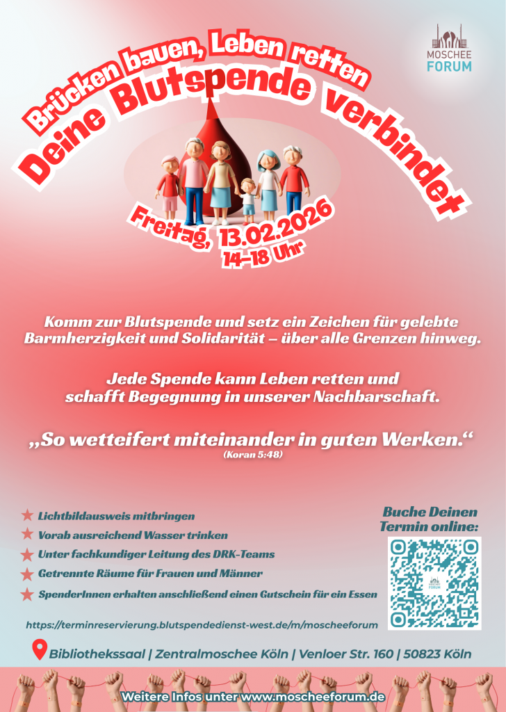 Bitte buchen Sie vorab einen Termin über die Webseite: https://terminreservierung.blutspendedienst-west.de/m/moscheeforum