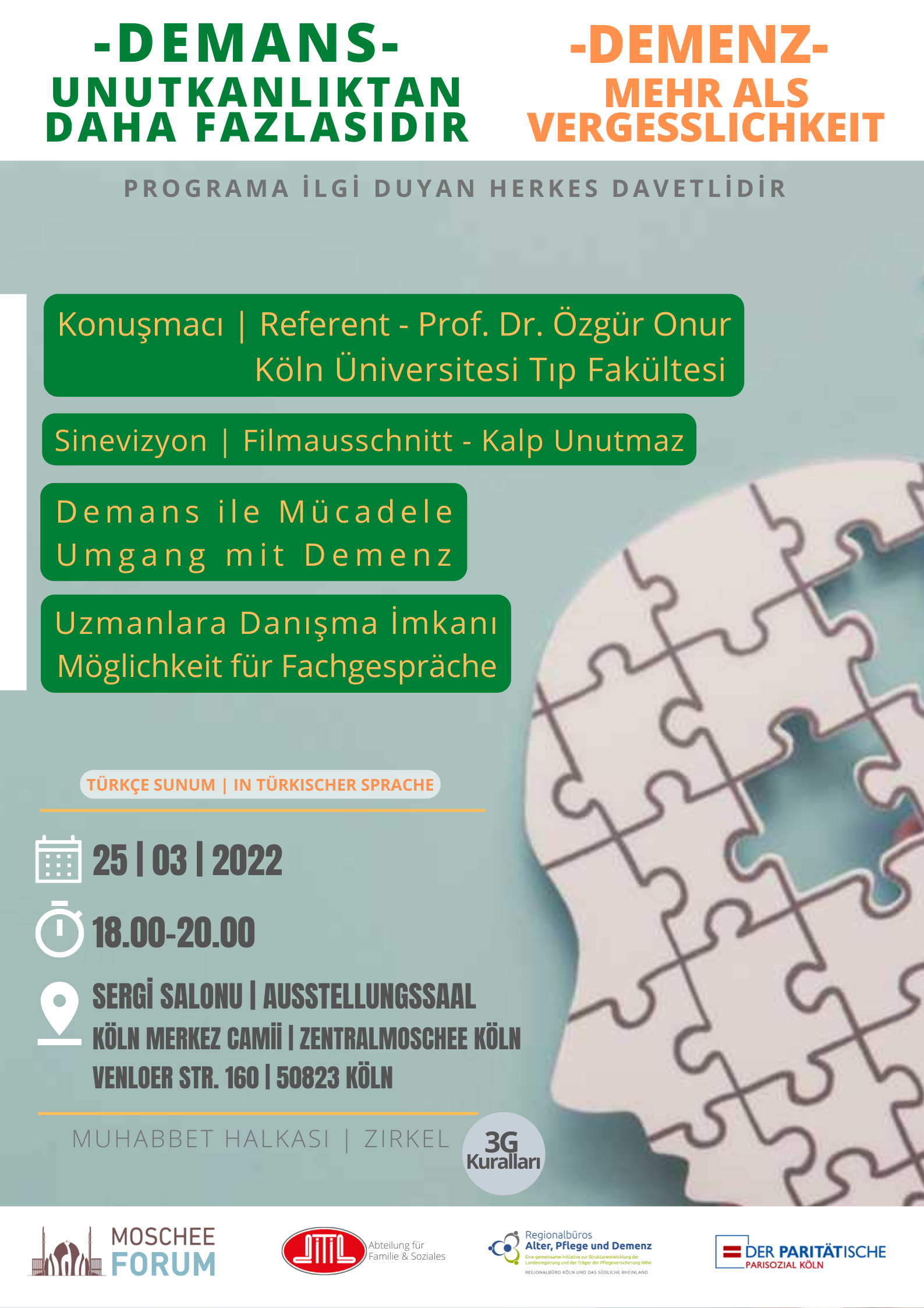Das MoscheeForum veranstaltet in Kooperation mit der DITIB Abteilung für Familie und Soziales, der Paritätische – Parisozial Köln und den Regionalbüros Alter, Pflege und Demenz des Regionalbüro Köln und das südliche Rheinland, zum Thema Demenz einen Informationsabend in türkischer Sprache.