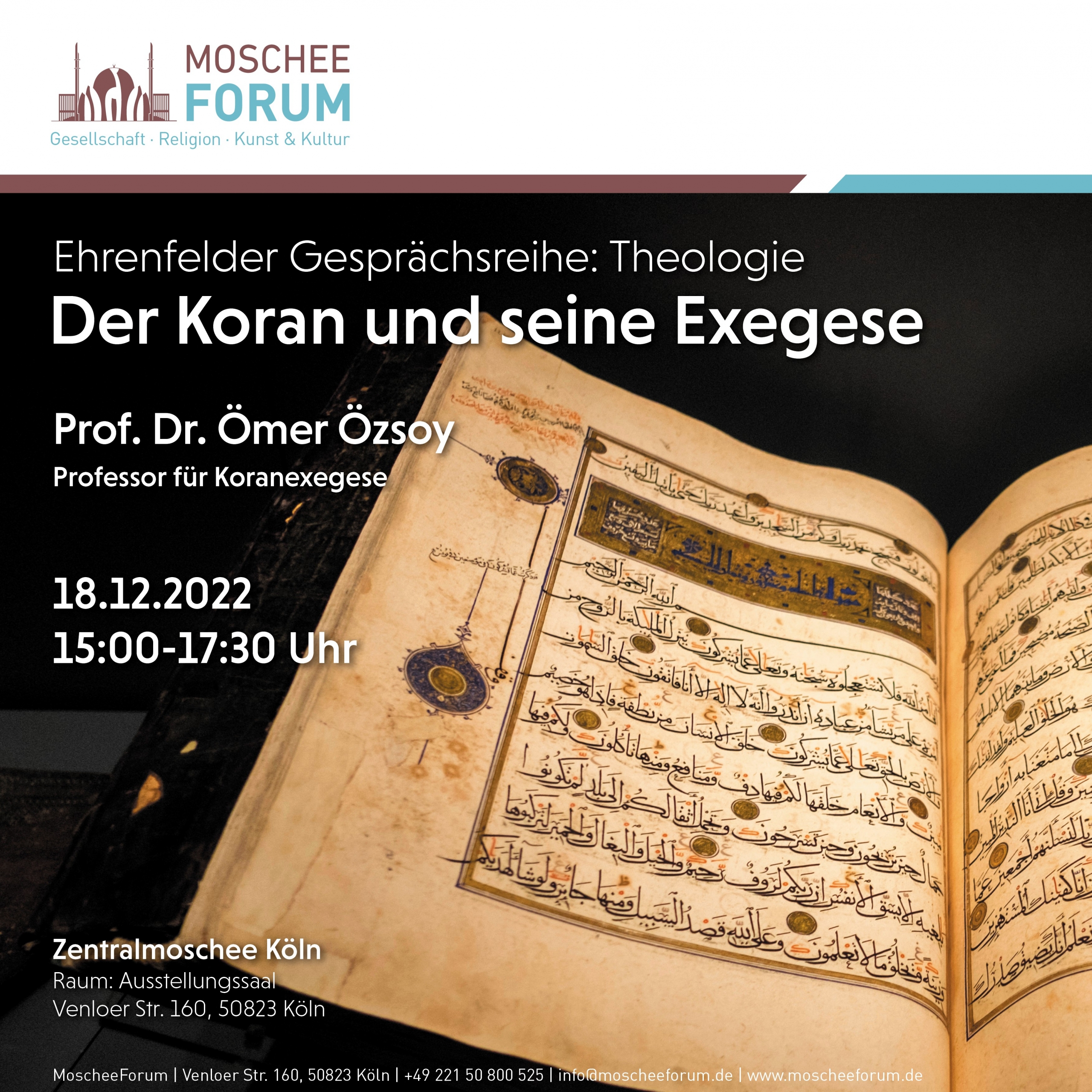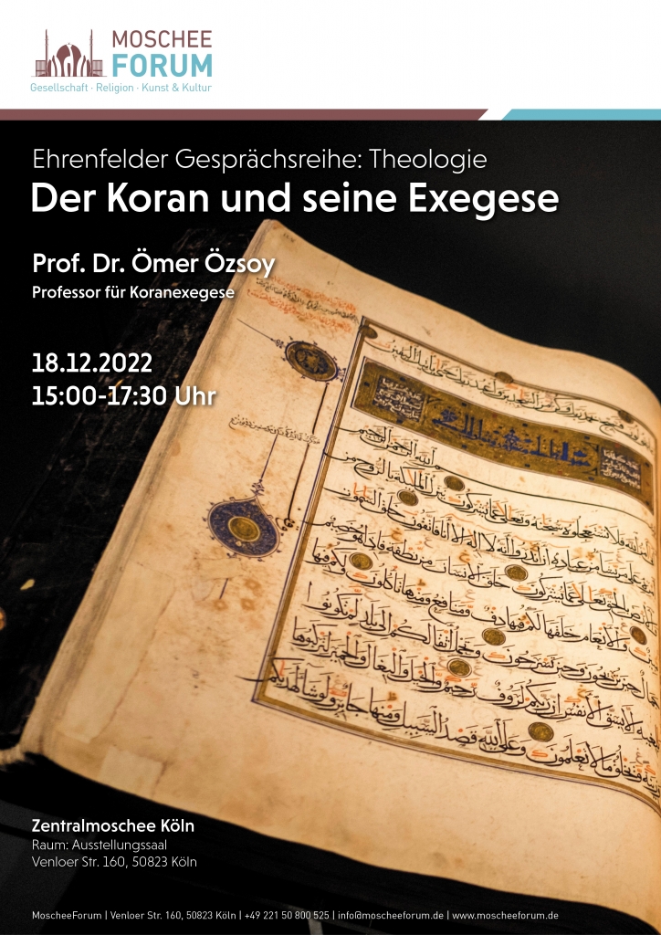 Die Ehrenfelder Gesprächsreihe startet mit dem Bereich der Theologie. Im zweiten Teil der Ehrenfelder Gesprächsreihe wird die Exegese des Koran analysiert. Zum Thema,, Der Koran und seine Exegese“ wird Herr Prof.Dr. Ömer Özsoy referieren. Herr Özsoy ist Professor für Koranexegese an der Goethe Universität Frankfurt.