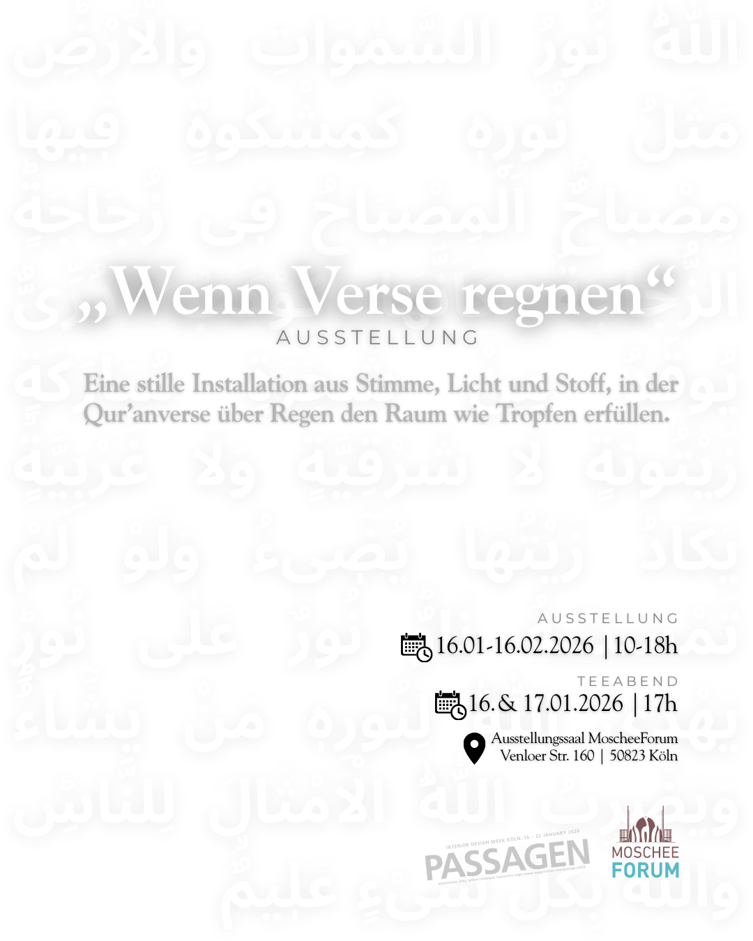 Die Zentralmoschee Köln wird im Januar zu einem stillen Erfahrungsraum: Die Installation „Wenn Verse regnen“ lädt zu einem haptischen Interieur-Erlebnis ein, in dem Stimme, Licht und Stoff wie fallende Tropfen zusammenwirken. Qur’anverse über Regen erscheinen als Textprojektionen im Raum – ein poetisches „Herabrieseln“, das nicht nur sichtbar wird, sondern als Gabe, Trost und Liebe erfahrbar macht, was Offenbarung im Inneren bedeuten kann.