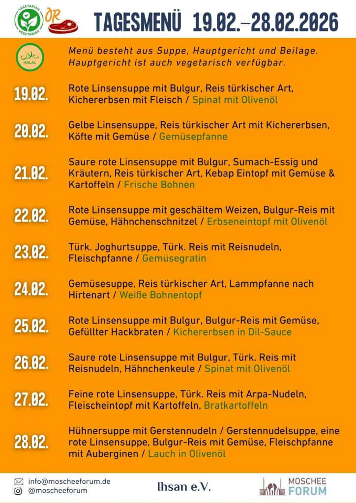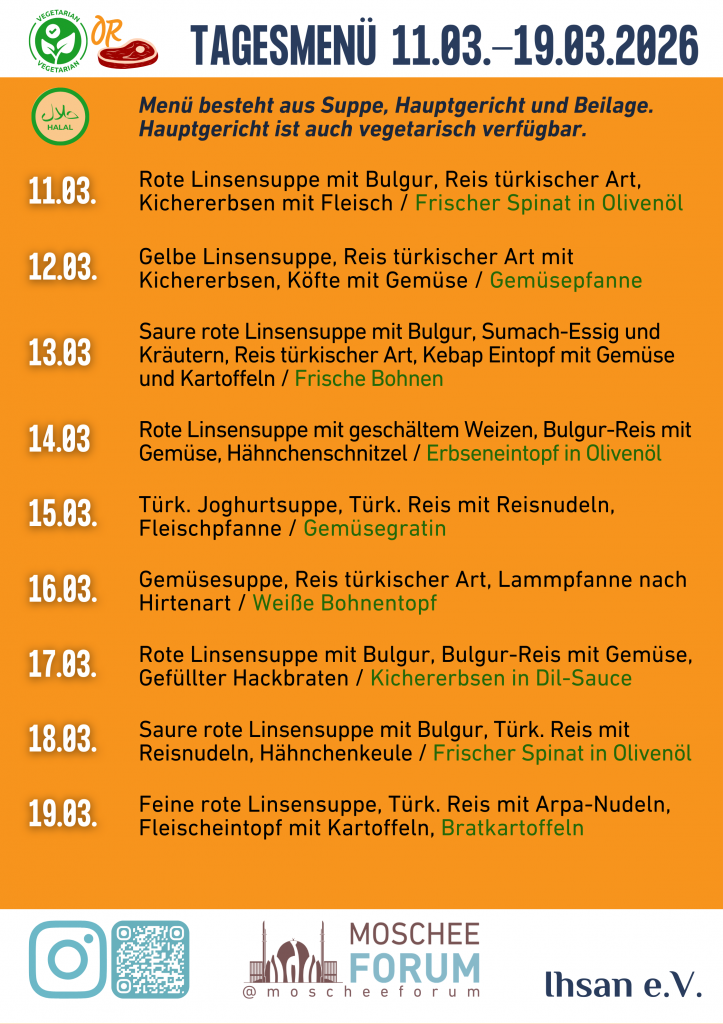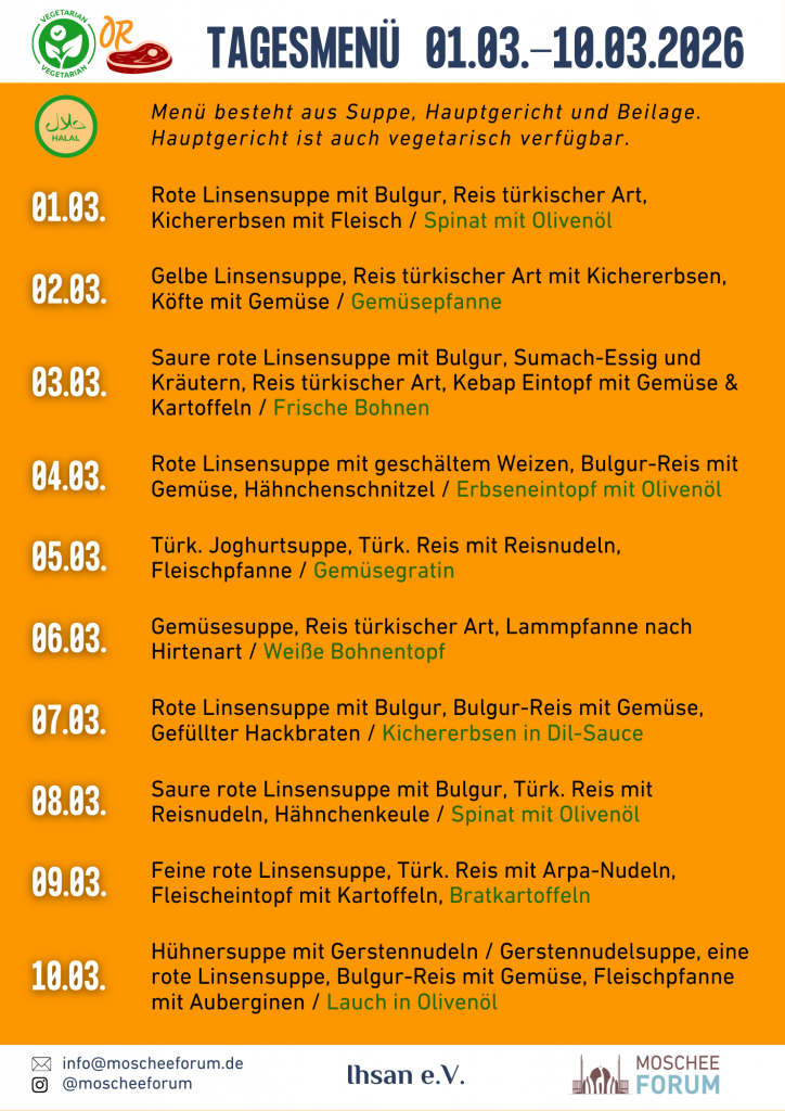 Das Streben nach Wissen ist im Islam tief verwurzelt und gilt als eine der edelsten Aufgaben des Menschen. Wir wissen, dass der intensive akademische Betrieb für Studierende sowie Dozentinnen und Dozenten eine Herausforderung sein kann, besonders während der Fastenzeit. Um Sie in Ihrem Engagement für Bildung und Wissenschaft zu unterstützen, möchten wir Ihnen den Übergang in den Feierabend erleichtern.