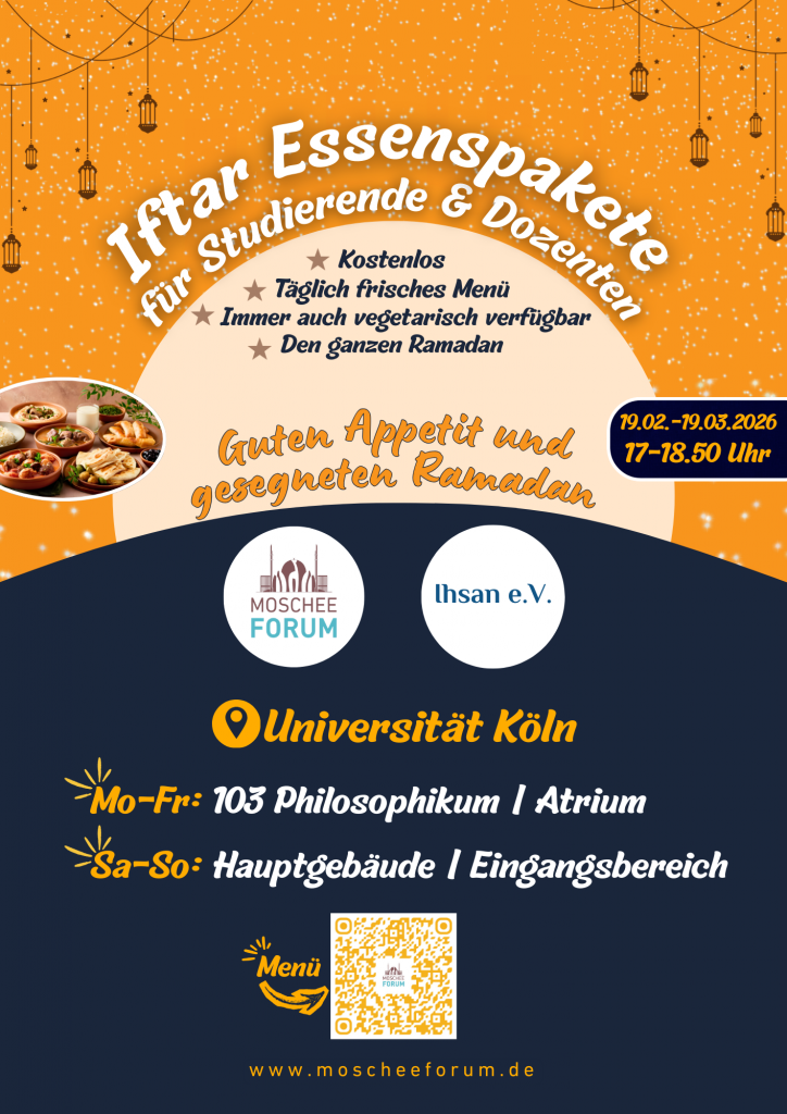 Unter dem Leitmotiv „Ramadan-Moschee-Leben“ bringt das MoscheeForum in diesem Jahr die Werte des Fastenmonats direkt ins Herz der Universität zu Köln. Der Ramadan ist eine Zeit der Nächstenliebe und der praktischen Unterstützung – Werte, die wir durch unsere tägliche Verteilaktion im Philosophikum sichtbar machen möchten.