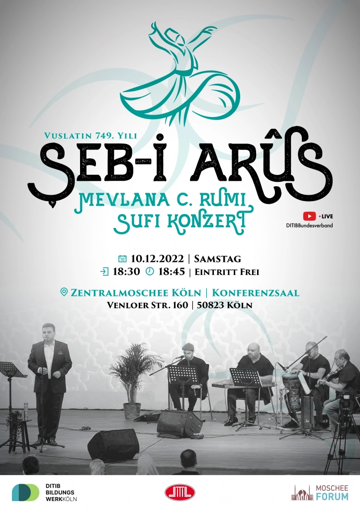 Anlässlich des 749. Gedenkjahres zum Tod des berühmten islamischen Mystikers Mevlana Celaleddin Rumi laden wir Sie zum Şeb-i Arûs Sufi Konzert in die Zentralmoschee Köln ein.