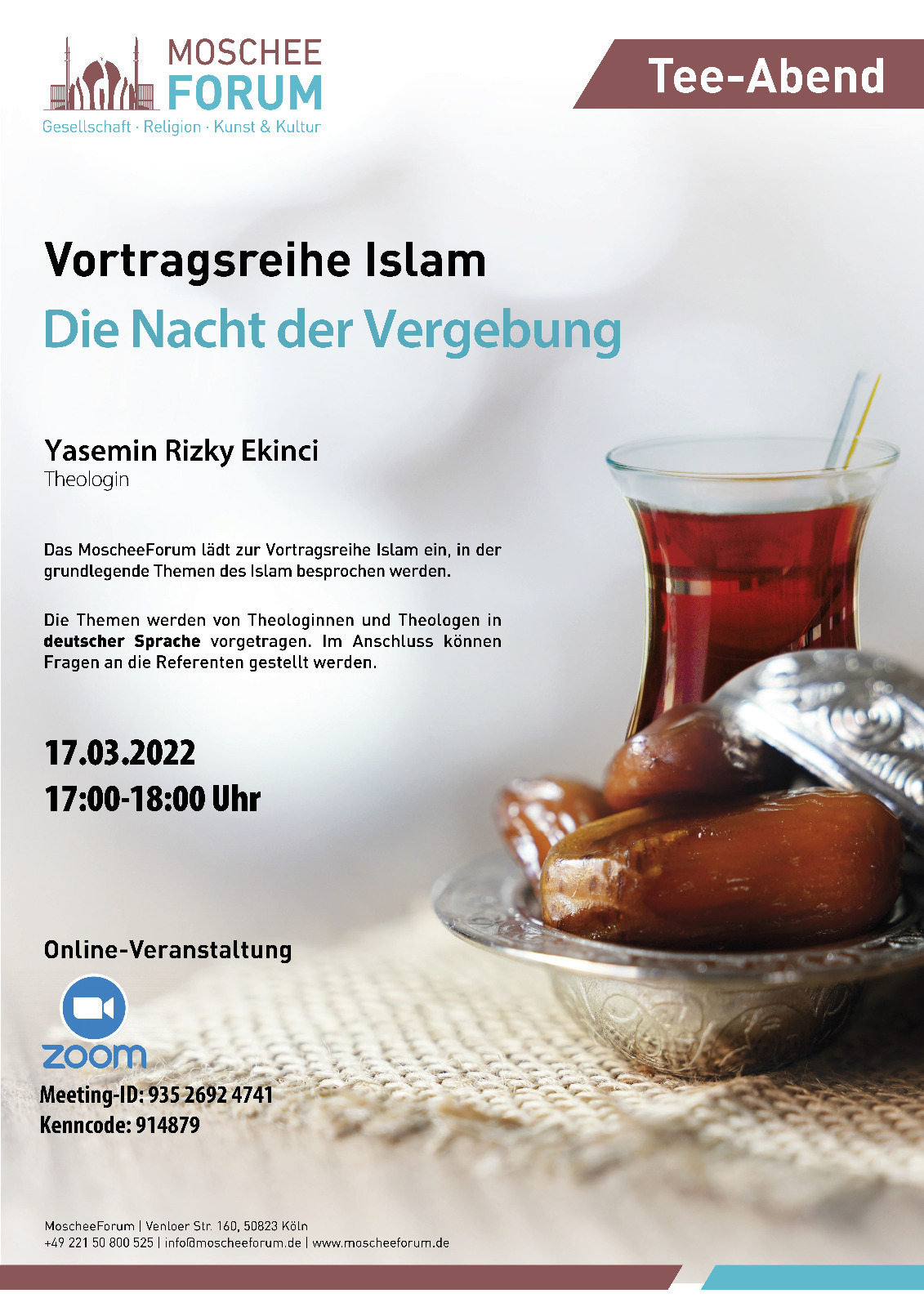 Das MoscheeForum lädt Sie zum nächsten Tee-Abend in 2022 zum Thema ,,Die Nacht der Vergebung”, vorgetragen von der Theologin Yasemin Rizky Ekinci, herzlich ein. Die Veranstaltung wird online ausgetragen.