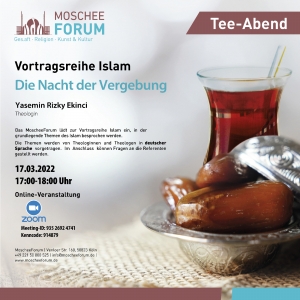 Das MoscheeForum lädt Sie zum nächsten Tee-Abend in 2022 zum Thema ,,Die Nacht der Vergebung”, vorgetragen von der Theologin Yasemin Rizky Ekinci, herzlich ein. Die Veranstaltung wird online ausgetragen.
