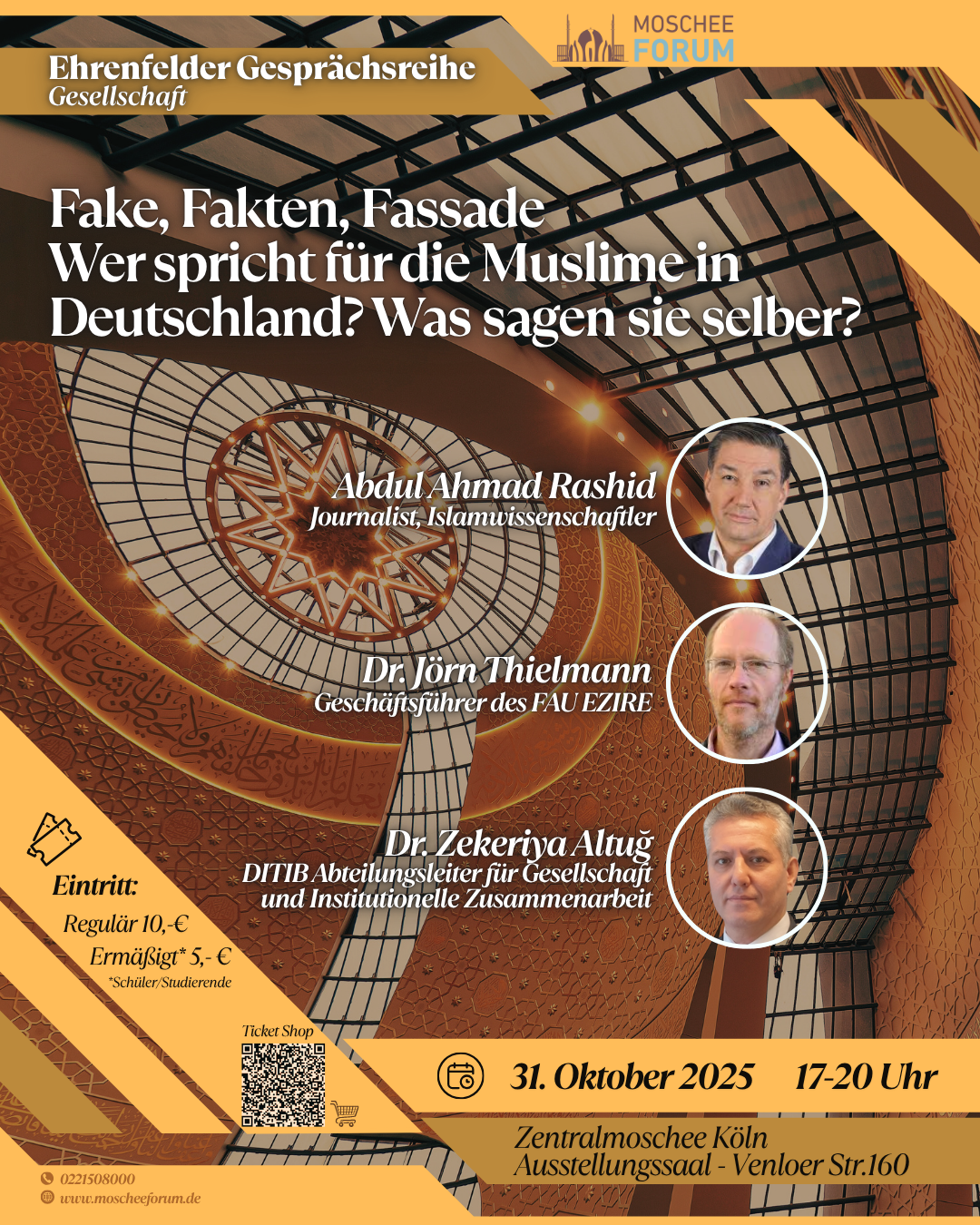 Ehrenfelder Gesprächsreihe – Gesellschaft (Auftakt) Mit der neuen Ehrenfelder Gesprächsreihe – Gesellschaft eröffnet das MoscheeForum einen Raum für fundierten, auch kontroversen Austausch an der Schnittstelle von Religion und Gesellschaft. Pro Ausgabe treffen wissenschaftliche, religiöse und zivilgesellschaftliche Perspektiven aufeinander – stets mit einer deutlich eingebrachten muslimischen Perspektive durch das MoscheeForum. Ziel…